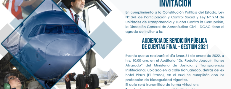 La Dirección General de Aeronáutica Civil – DGAC informó este lunes 31 de enero de 2022 el logro histórico de 92,32% de implementación efectiva en materia de Seguridad Operacional otorgada por la OACI, en la Rendición Pública de Cuentas Final – Gestión 2021, realizado de forma presencial y virtual en el Auditorio Rodolfo Illanes Alvarado Leer más …