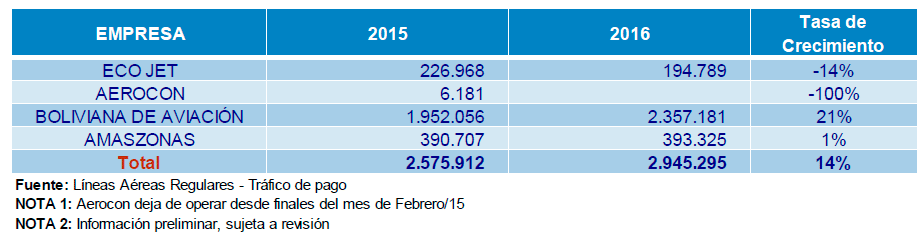 Asimismo, los datos señalan como máxima transportadora a Boliviana de Aviación (BoA) con 2.357.181 pasajeros, equivalente a un 21% de crecimiento, en comparación al 2015 que registró 1.952.056 personas, de acuerdo al siguiente detalle: